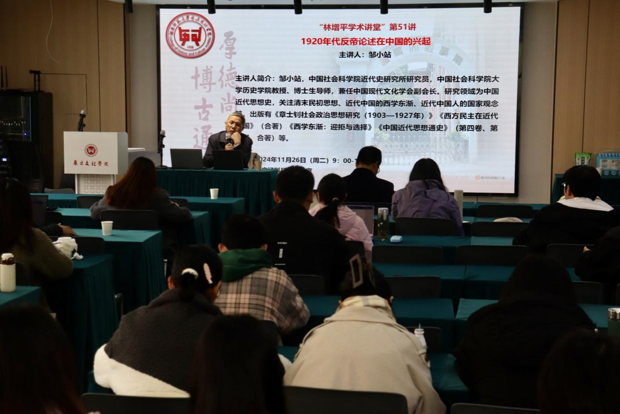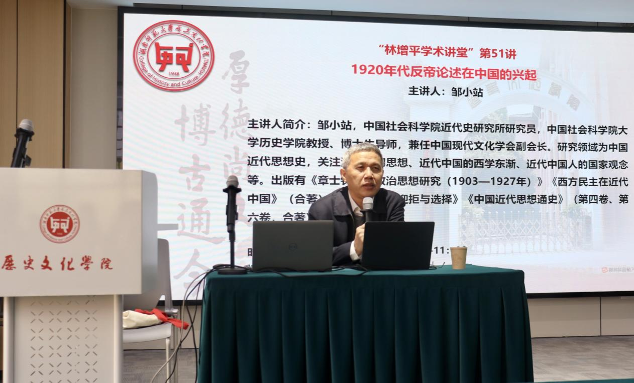 (通讯员李澳琳肖骁)2024年11月26日,英国365集团林增平学术讲座第51讲在三棵树科研楼305学术报告厅举行,中国社会科学院近代史研究所研究员邹小站教授应邀开展《1920年代反帝论述在中国的兴起》专题讲座。本次讲座由英国365集团院长刘利民教授主持,英国365集团部分老师以及学生参与讲座。