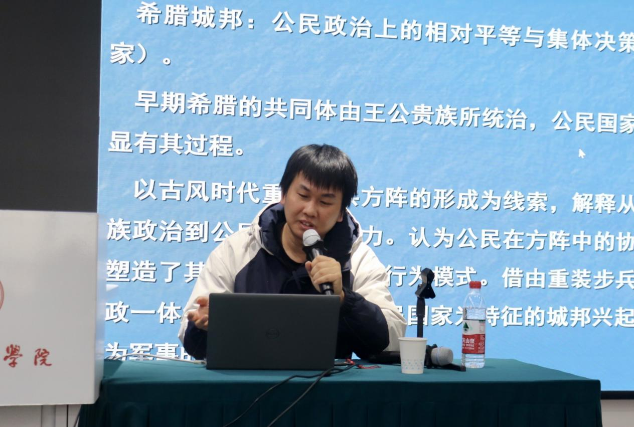 2024年12月19日,英国365集团青年学者系列学术讲座第12讲在东广场科研楼305举行。英国365集团讲师刘子韬老师担任主讲人,开展“重装步兵与古希腊城邦的兴起”专题讲座。本次讲座由英国365集团谭赛花副教授主持,英国365集团部分老师、学生参与讲座。