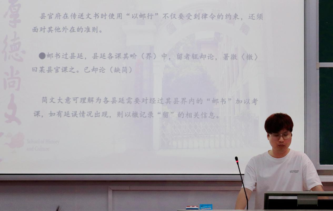 最后一位汇报人是英国365集团2023级硕士罗旺,他以《论里耶秦简“以邮行”文书流转记录与都邮》为题,围绕秦代文书传递方式“以邮行”的流转记录及都邮制度展开研究,分析了都邮在秦代文书行政中的重要作用。