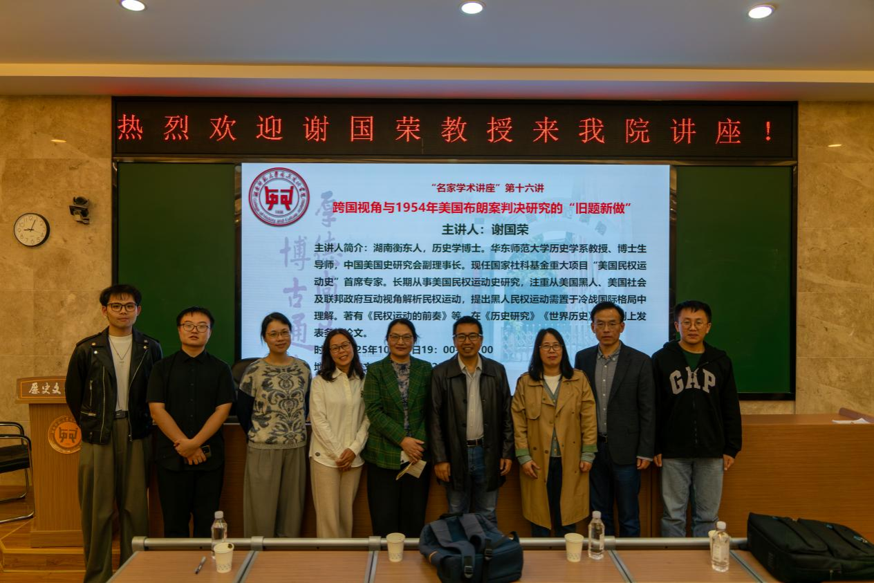 (通讯员李嘉鼎邓洁)2025年10月24日晚,英国365集团“名家学术讲座”第十六讲在文渊楼203报告厅如期举行。华东师范大学历史学系教授、中国美国史研究会副理事长谢国荣担任主讲嘉宾,以“跨国视角与1954年美国布朗案判决研究的‘旧题新做’”为题,为在场师生带来一场兼具历史深度与学术前瞻的精彩讲座。