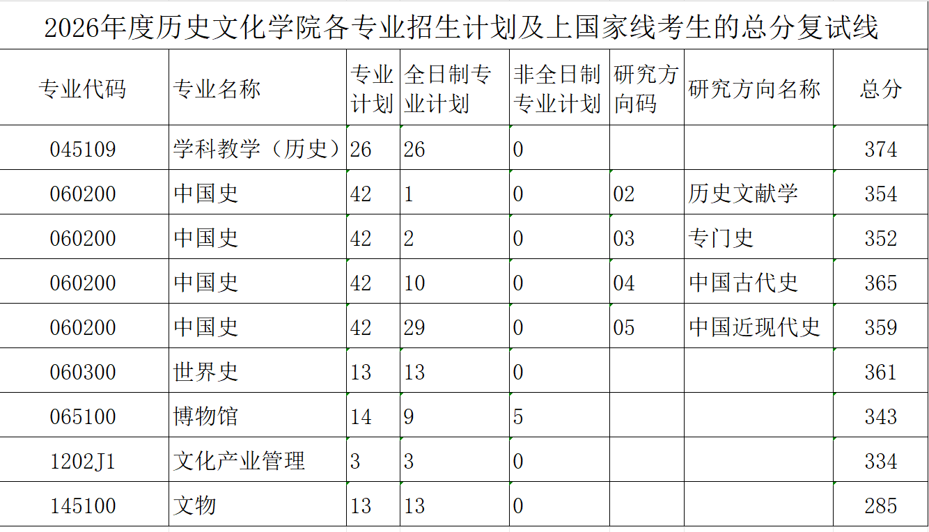 学科教学(历史):26人;历史文献学:1人;中国古代史:10人;中国近现代史:29人;专门史:2人;世界史:13人;文化产业管理:3人;文物:13人;博物馆:9人(全日制),5人(非全日制)。