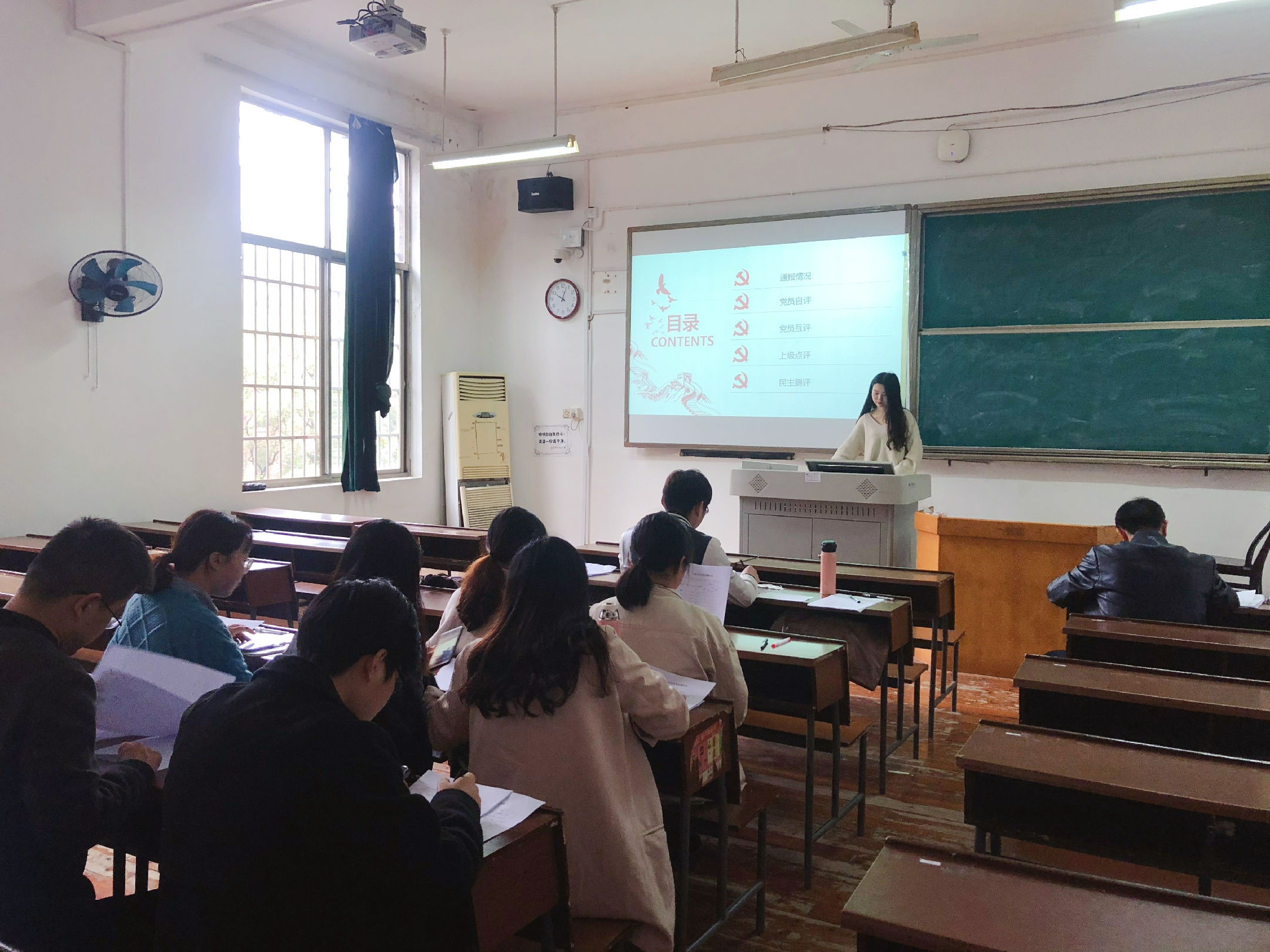 会议伊始,支部书记蔡芳进行述职,通报2018-2019年度的工作情况,总结过去一年的工作,提出了支部工作的优缺点,肯定了各位同志对支部工作的大力支持与积极参与。紧接着,蔡芳同志对民主评议的基本内容、基本原则进行了简单介绍,强调了民主评议会中的互相批评是支部进步的重要推动力,让同志们“红红脸,出出汗”更有利于党员自身发展与支部建设。随后,支部十二名党员进行自评与互评。在这一环节中,党员同志们积极发言,按照党员标准,毫不避讳地进行了严肃认真、实事求是的自评与互评。随后,副院长徐良利对此次民主评议会进行点评。徐副院长首先肯定了这次民主评议会的组织形式以及党员同志们的发言,接着,对支部的各学生党员提出了一些要求:第一、作为学生党员,一定要刻苦学习,在专业学习上要起到模范带头作用。在生活中也要严格要求自己,用言与行带动身边的同学,团结群众学生。第二、作为党员,要拥有坚定的共产主义信念,要不断端正自己的入党动机,不仅是在组织上入党,更要在思想上入党,要时刻以优秀党员的标准严格要求自己,加强理论学习,增强党性修养。活动最后,支部党员以不记名的形式,填写并上交了民主测评表。本次民主评议会在严肃活泼的氛围中圆满结束。