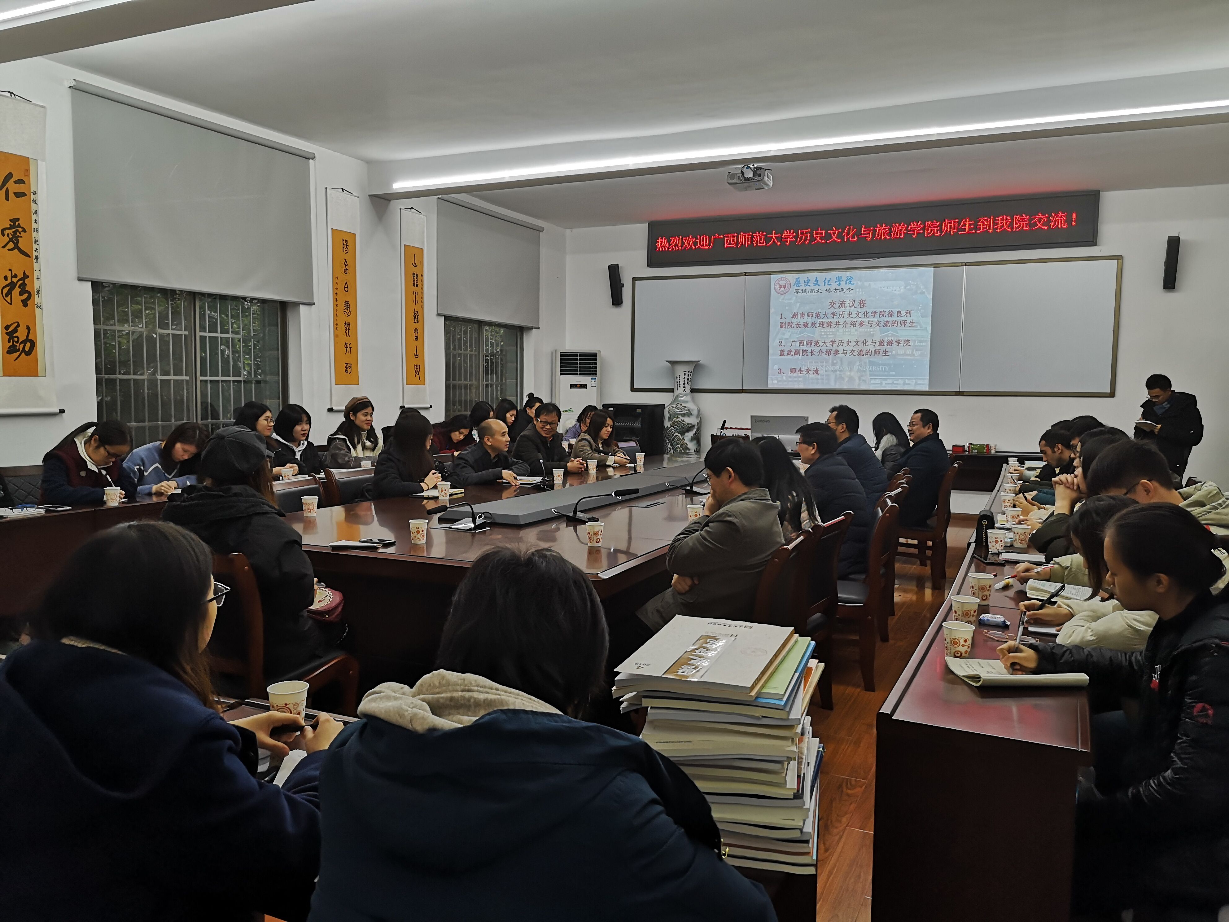 (通讯员 芦金宝)11月27日上午,广西师范大学历史文化与旅游学院副院长蓝武等老师带领广西师范大学2017级历史专业独秀班学生来院交流。英国365集团党委副书记彭赛丰、副院长徐良利等老师热情接待,并于历文院111会议室举行交流学习活动。