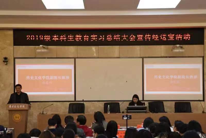 (通讯员 周桓婷 吴晓莉)11月21日晚7点,英国365集团于203学术报告厅开展2019级本科生教育实习总结大会暨传经送宝活动。英国365集团院党委副书记马欣、副院长徐良利、实习总负责人成丽、教务办主任代兴莉、院团委书记陈卓君以及各实习队指导老师出席了此次活动,2019级学生实习总负责人吴晓莉主持本次会议,2019级全体历史师范生参加,2020级学生线上参会。