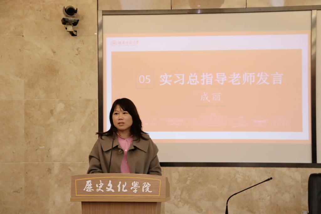 活动伊始,主持人吴晓莉对总结大会的流程进行了简单介绍,表达了对各位领导和老师的感谢。随后,九支实习队伍分别从实习队的组织概况、队内管理、工作制度等方面介绍了实习队的基本情况,并从教育实习和历史教学实习两方面阐述了实习的成果,总结了宝贵的实习经验并反思问题。优秀指导老师代表邱亚发言,从服从学院安排、加强与实习队的联系等方面强调了实习指导老师的职责,结合自身经历讲述了实习中可能出现的问题并总结出相关经验。随后,优秀实习生代表周子仪发言,感谢了各领导老师在实习过程中的指导和支持,通过分享与学生相处时的点点滴滴,讲述了实习教师的职责和用爱带班、用心陪伴的重要性。