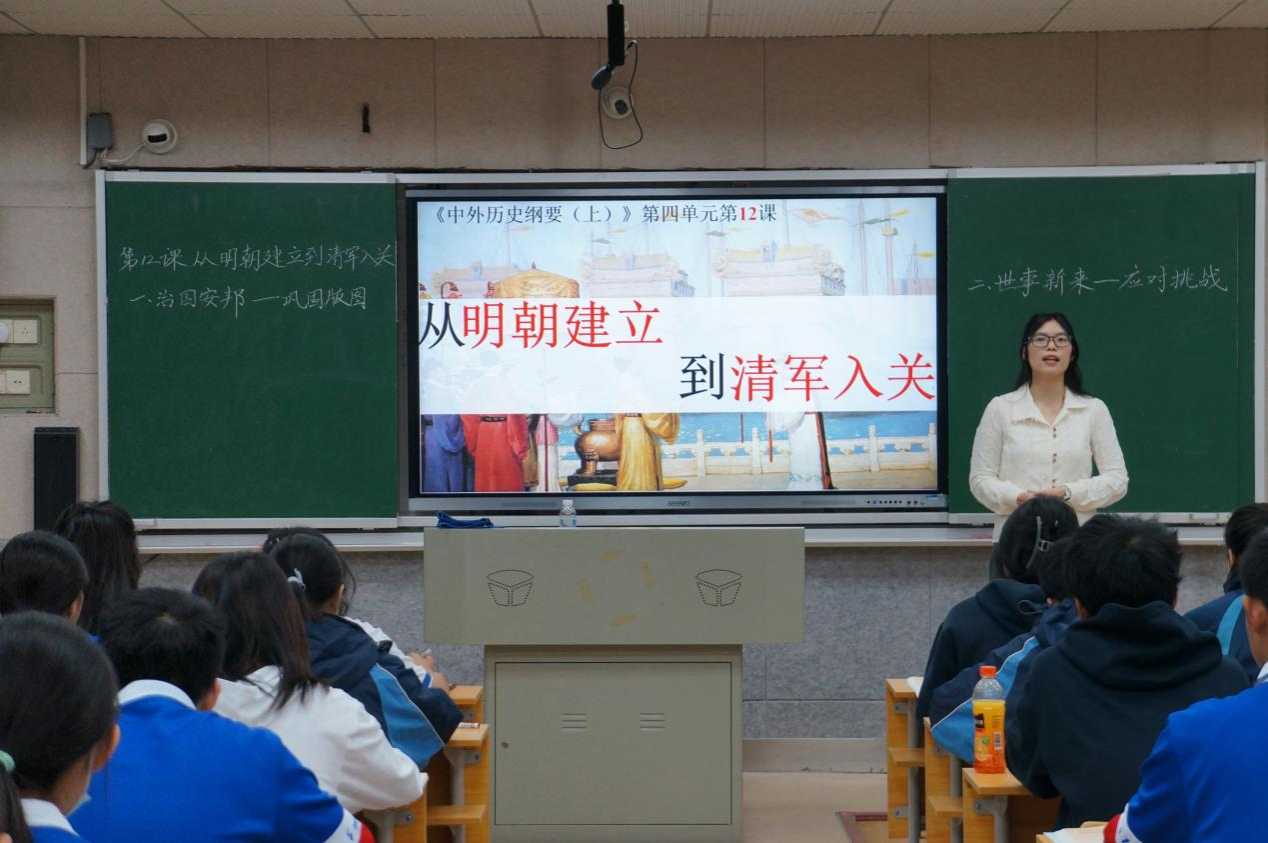 活动伊始,我队袁湘琴教师率先执教中外历史纲要上《第12课 从明朝的建立到清朝入关》。袁湘琴充分考虑学生学情,对教材内容进行深度整合,精准抓住了教学的重难点,积极创设情境,以问题引领进行突破。随后,刘慧文老师进行授课。刘慧文紧扣课标要求,对教材进行整合重构,以“十字路口的大明”为主题贯穿全篇,将教材有效整合成“制度之变”与“世界之变”两个板块,既注重了课堂的知识性,同时提升了学生的唯物史观等核心素养。