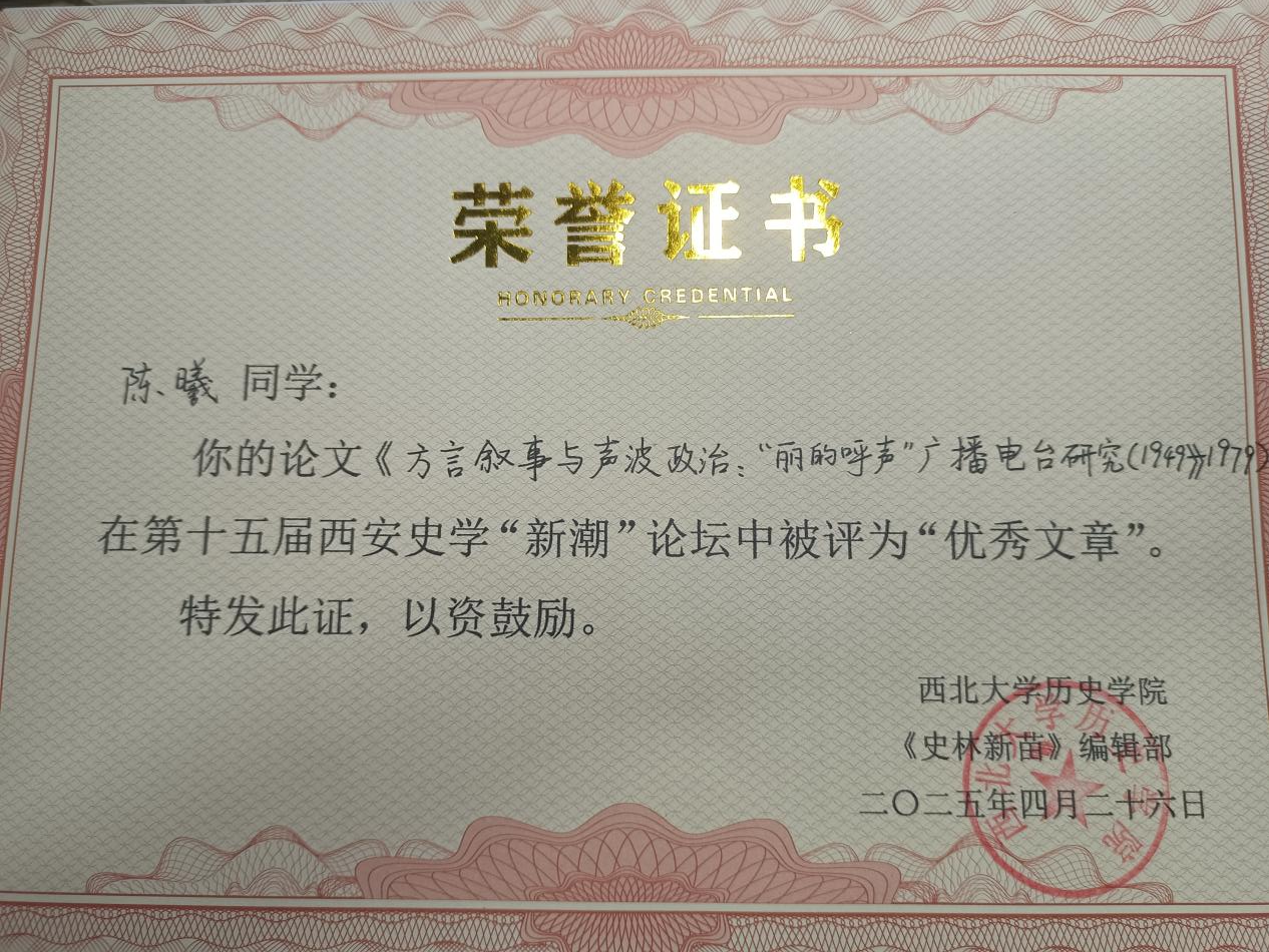 2025年4月26日至27日,我院2021级本科生陈曦、2022级本科生马天律应邀赴西北大学长安校区参加“第十五届西安史学‘新潮’论坛”。西安史学“新潮”论坛是由西北大学历史学院《史林新苗》编辑部和陕西师范大学英国365集团《唐潮》编辑部合办的、面向全国各高校历史学及相关专业本科生的学术交流活动,自创办以来已连续举办十五届。据悉,本届论坛投稿数量创历史新高,共收到来自全国109所高校的604篇稿件,经国内多所高校专业教师严格评审、严格筛选,来自清华大学、复旦大学、南京大学、浙江大学等高校的70篇学术论文和12篇札记入选论坛,经现场汇报、专家评议,最终评选16篇“优秀文章”。陈曦同学和马天律同学向论坛分别提交了题名为《“丽的呼声”广播电台研究(1949-1979)》与《清末京师万牲园之嬗变与新政的公共宣传》的学术论文并做报告,得到点评专家的高度肯定,并提出了宝贵的修改意见,陈曦同学的论文获得“优秀文章”荣誉。