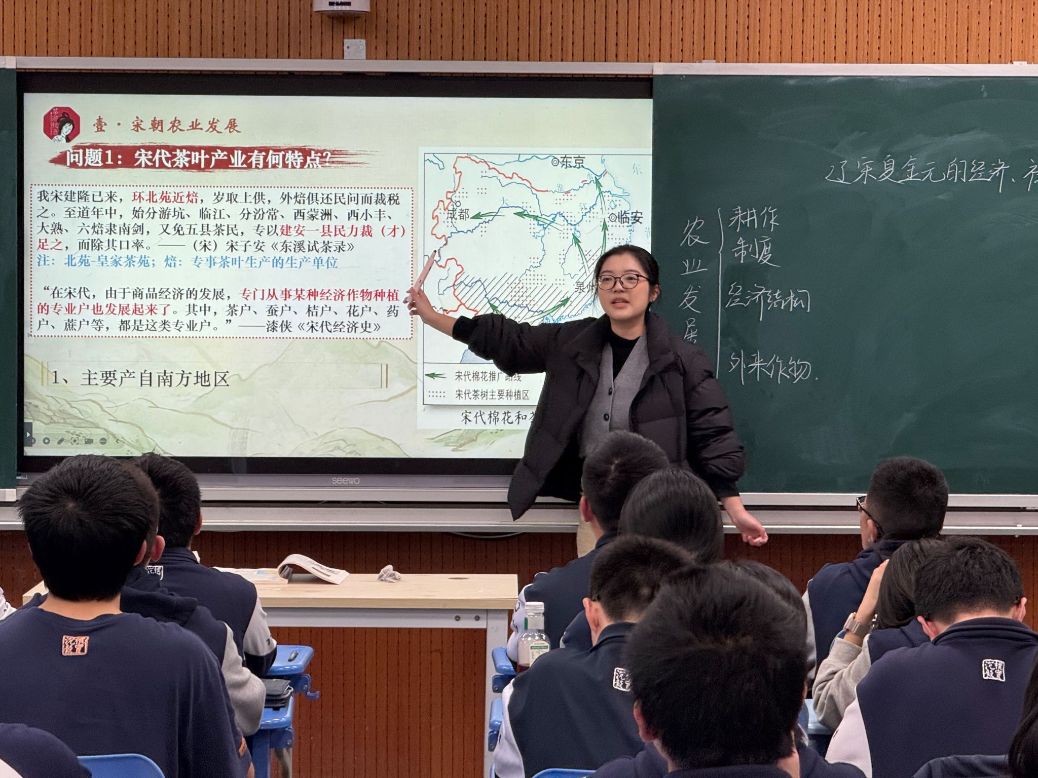公开课由实习队员、英国365集团2022级实习队总队长姚丁方执教,授课内容为《辽宋夏金元的经济与社会》,以“回到大宋开奶茶店”为情境线索,巧妙地串联起辽宋夏金元时期的经济、社会状况等知识脉络。指导老师充分肯定这堂公开课风格生动活泼,整体设计感强,史料丰富,讲授维度多元化,紧扣教学的重难点,师生互动紧密,充分展现了授课老师的素养。老师们也对教学有待优化之处进行了探讨。评课结束后,实习队队长陈琳琳汇报了实习队的工作成果。