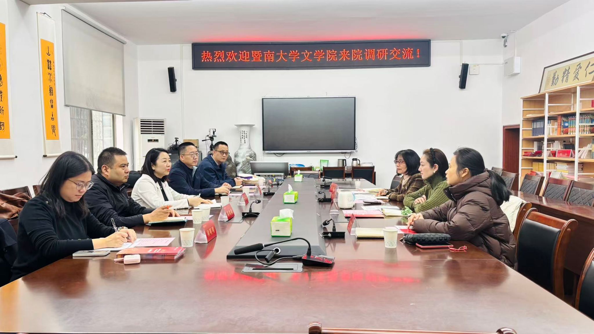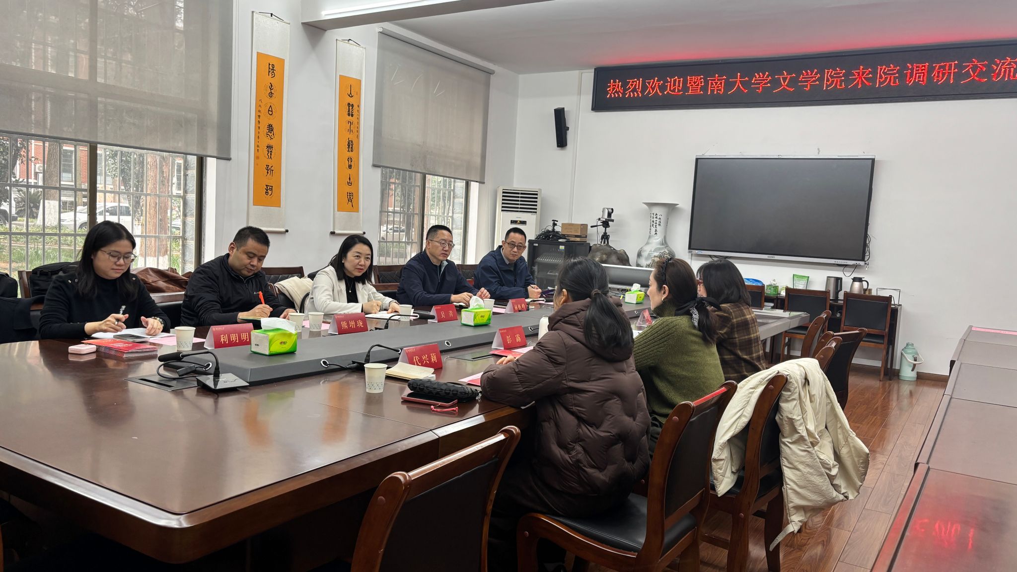 2025年12月22日下午3点,暨南大学文学院副院长吴青、历史系副主任熊增珑、中文系副主任温明明、教学科研办公室主任赫栋峰、教科办秘书利明明到我院调研交流。学院副书记(主持党委日常工作)彭露、副院长傅新球、科研办公室主任兰岚、教务办主任代兴莉参加座谈交流。双方就历史学(师范)本科人才培训方案修订、历史学(师范)专业实习、历史学(师范)专业人工智能时代背景下传统文科专业改造升级的举措、博士后招聘等问题进行了深入交流。