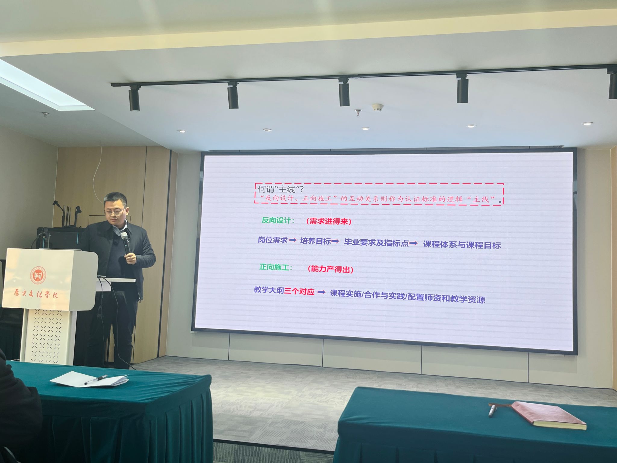 会上,历史学专业主任银品围绕师范三级认证标准展开系统培训,重点解读“学生中心、产出导向、持续改进”的OBE核心理念,分析了2025版人才培养方案与2023版方案的异同之处与进阶要求。同时,结合教学实践,对课程设置、课堂教学、考核评价等各环节的规范化要求进行详细说明,强调需以认证标准为引领,提升人才培养质量。
