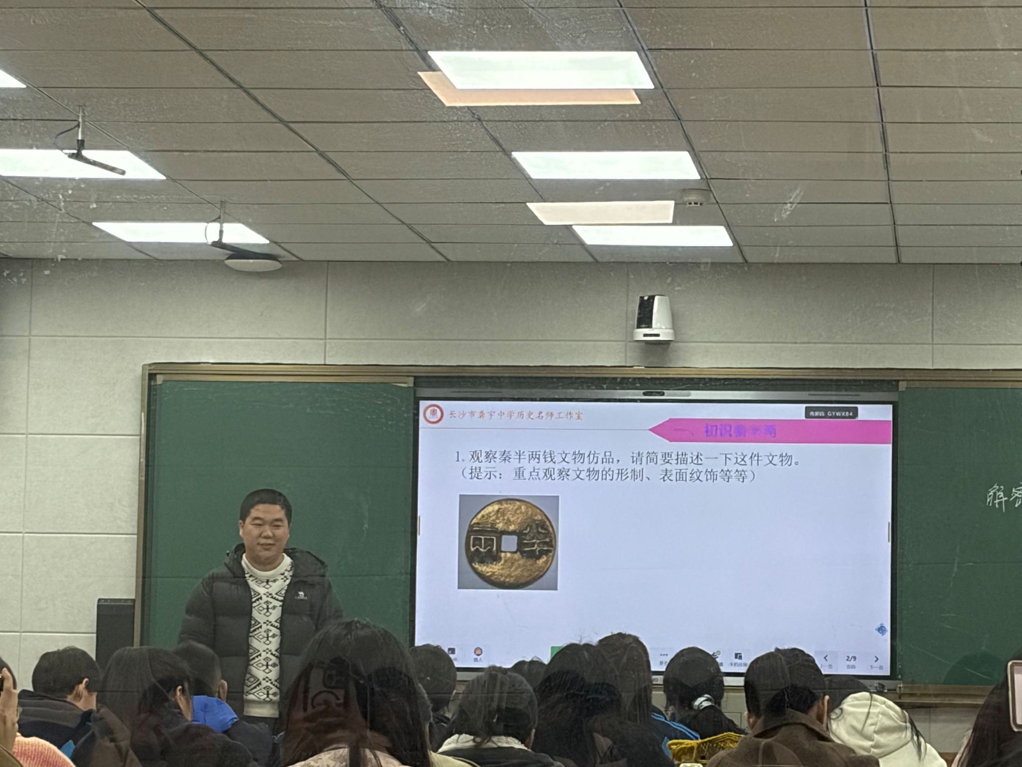 最后,伍炎老师课堂展示《解密秦半两》,以文物为切入点,围绕秦半两的形制、由来、推行与意义展开教学,紧扣秦朝统一与中央集权主题,将历史实物与课堂教学深度融合,展现“启・发”式教学的实践魅力。