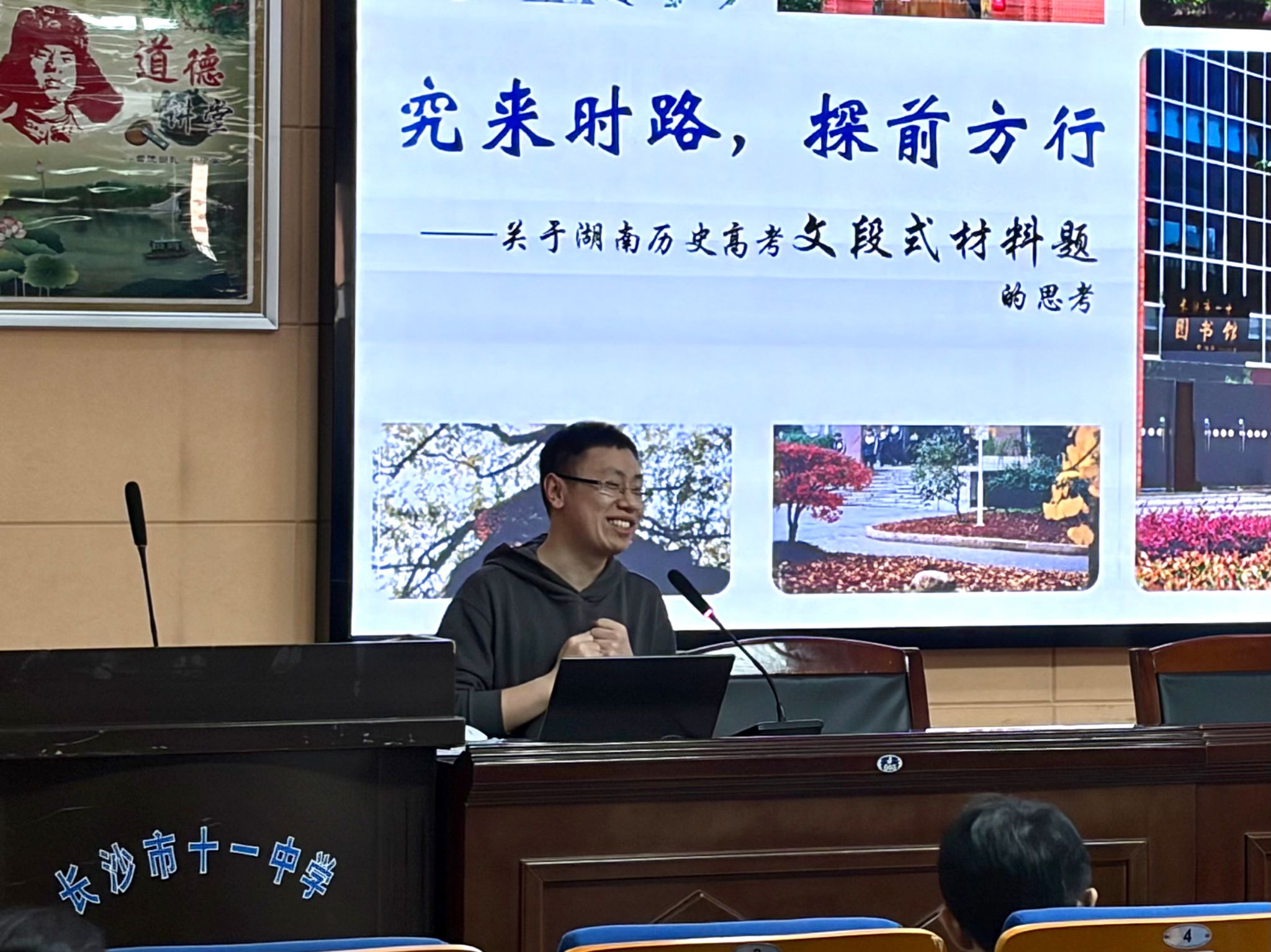 14:00,长沙市第十一中学王志文主任为此次研讨会致辞,传达此次教研活动相互交流、促进历史教师教学能力与水平提高的会议精神,祝愿此次会议圆满成功。随后,张博文老师带来专题讲座《究来时路,探前方行——关于湖南历史高考文段式材料题的思考》。实习队员全程认真聆听、详细记录,在讲座后开展了集中学习研讨。