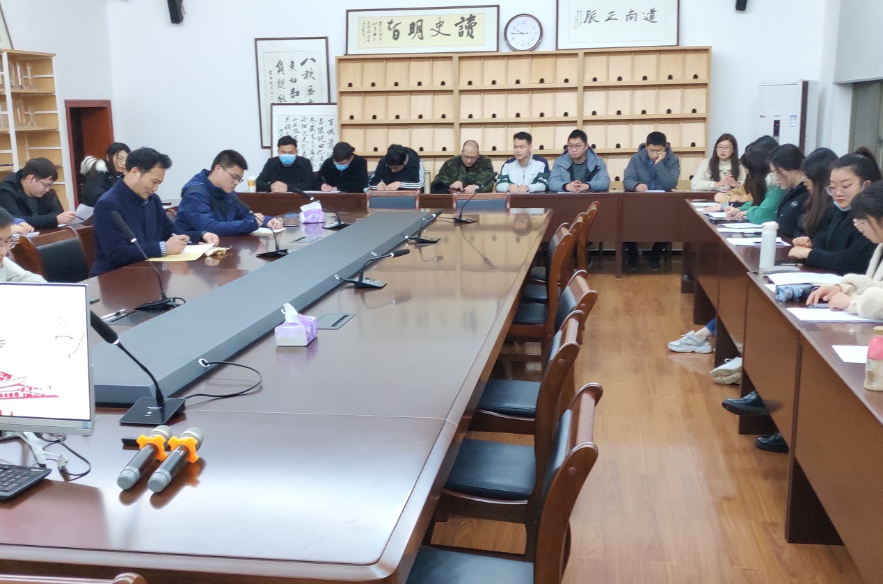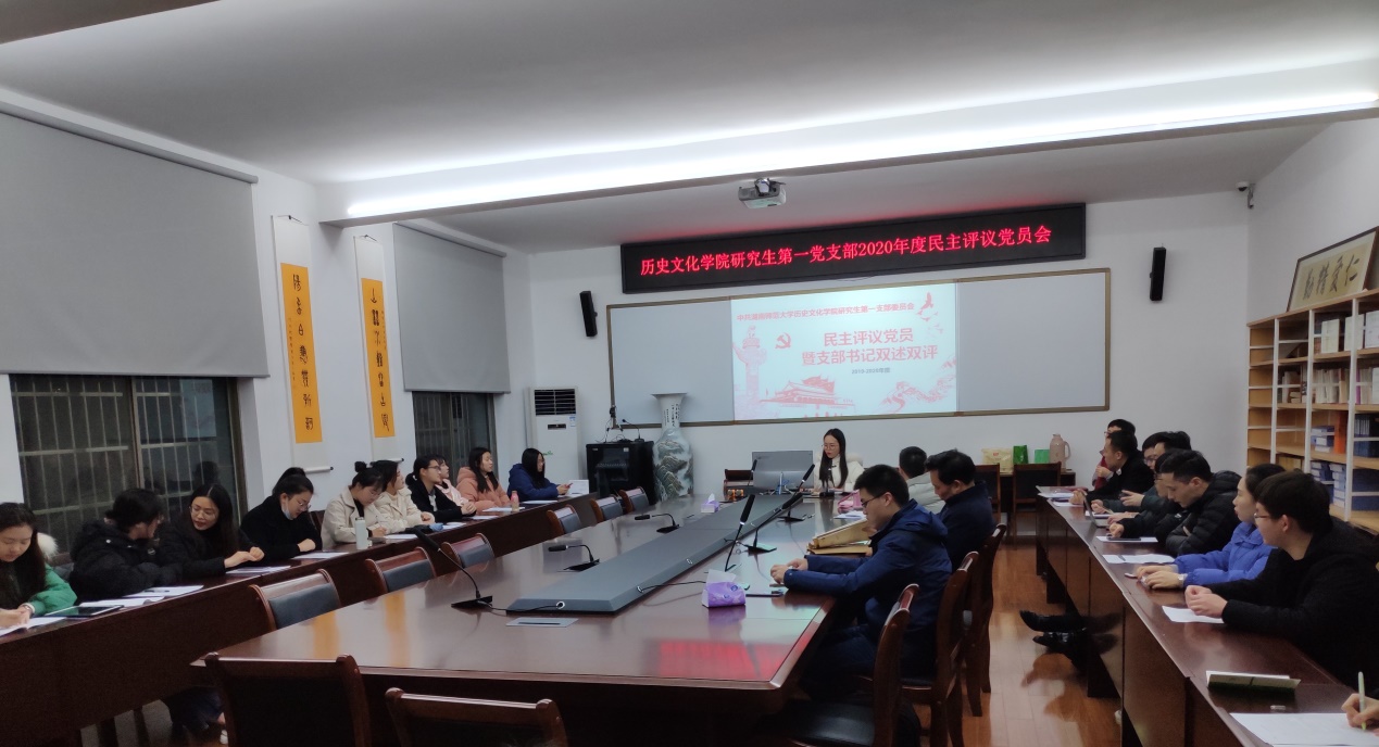(通讯员程顺)3月8日18时30分,历文院研究生第一党支部于学院111会议室召开2020年度组织生活会暨民主评议党员会。本次会议由党支部副书记刘桂同志主持,院长钟声同志莅临指导。此外,支部共有34名党员参加会议,其中正式党员28人,预备党员6人。