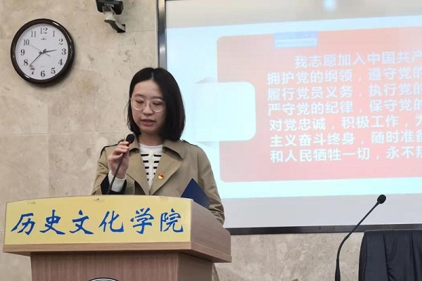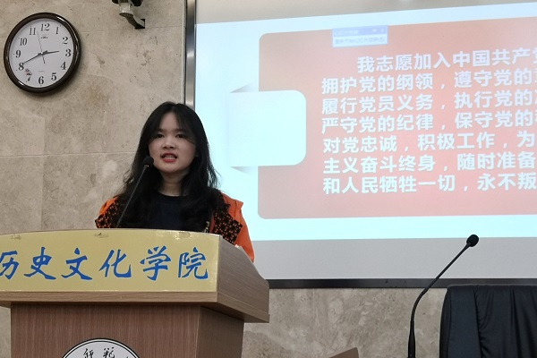 新党员代表2019级历史基地班唐萃仪、学员代表2020级历史教育班黄楚依同学进行了发言。