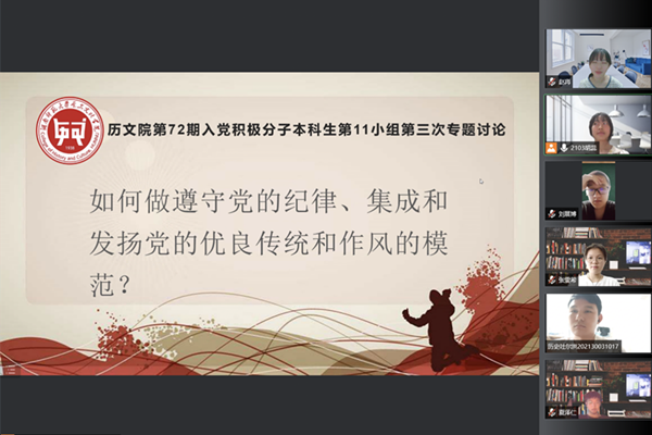 (通讯员 胡蕊 刘展博)近日,历文院第72期入党积极分子培训班全体成员采取线上线下相结合的方式,开展了专题讨论活动,讨论围绕“如何做遵守党的纪律、继承和发扬党的优良传统和作风的模范?”的主题展开。讨论活动由各组组长主持,历文院第72期入党积极分子培训班全体成员参加。