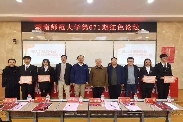 论坛伊始,全场肃立,齐唱国歌。接着,陈卓君围绕此次会议主题“聚力共促新伟业 昂首迈步新征程”致辞。随后,2020级历史教育班董小艳以“向日承重任,秉烛铸民魂”为题,从师范生角度着重阐述师范生应如何传承好红色基因;2021级历史教育班李张林以“奋斗”为线索,从往昔革命的信仰到未来征程与使命,呼吁青年学子接续薪火、奋斗新时代。中场环节,与会成员共同观看由历文学生讲述青年人物故事的节目《在二十大回望:人民接力棒的传承》。2021级历史教育班李艾结合党的二十大精神,从“践初心”“担使命”两个方面阐述了时代青年行进道路与奋斗方向;2020级历史教育班周家璇围绕全面推行河长制的关键点,阐述了保护生态文明建设的重要性.